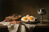 Dit stilleven combineert de eenvoud van een klassiek ontbijt met de elegantie van antiek zilverwerk. Twee goudkleurig gebakken eieren staan centraal, gepresenteerd op een sierlijk versierd zilveren dienblad. De stralende dooiers van de eieren vormen een levendig contrast met de donkere achtergrond en de koele glans van het zilver. De aandacht voor detail van het dienblad en de zilveren kan ernaast benadrukt de luxueuze kant van dit arrangement.