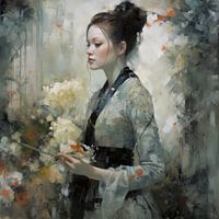 Klassiek portret "Romance". Portret van een jonge vrouw in een prachtige kimono, omringd door bloemen. Dit werk heeft een romantische en tikje klassieke sfeer. Een geweldig werk voor aan je muur!