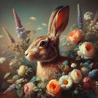 Een digitaal kunstwerk dat is geïnspireerd op oude schilderijen. Een klassiek portret van een konijn, omringd door oranje, blauwe en witte bloemen tegen een blauwe achtergrond.