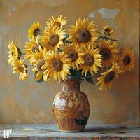 Een prachtig boeket zonnebloemen in een rustieke vaas voor een beschilderde muur.