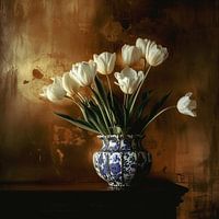 Een Delfts blauwe aardewerken vaas met een grote bos witte tulpen. Het boeket staat voor een goud kleurige achtergrond.