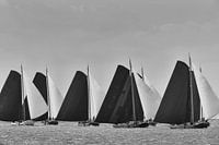 Klassieke Skutsje zeilschepen tijdens het jaarlijkse Skûtsjesilen kampioenschap in Friesland in zwart-wit. Afbeelding met een retro vintage look.