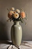 De rust en eenvoud van dit beeld spreken tot de verbeelding. Een zorgvuldig geschikte verzameling bloemen staat centraal in een klassieke vaas, die met zijn zachte kleuren een warme aanvulling vormt op elke ruimte. De bloemen, in tinten van wit en beige, lijken bijna te dansen in het stilleven, elk op hun eigen unieke wijze bijdragend aan het geheel. Het subtiele kleurgebruik en de delicate schaduwen zorgen voor een realistisch effect, terwijl de zachte achtergrond het onderwerp benadrukt. Dit ontwerp vangt de tijdloze schoonheid van de natuur en brengt deze met een vleugje klassieke charme naar het interieur. Het is een perfect stuk om een vleugje elegantie en rust te brengen in drukke leefruimtes of stille studeerkamers. Een bewijs van eenvoudige schoonheid, dit stilleven is een ode aan de natuur en een verrijking voor de kunstcollectie.