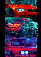 > Een gestileerd close-up portret van een rode klassieke BMW E46 M3, met intense details en gloeiende koplampen in een contrastrijke stijl.
