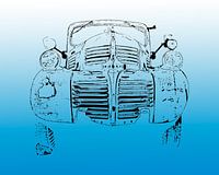 Voorste deel van een klassieke auto afgebeeld in een schetsmatige, minimalistische lijn. De afbeelding is opzettelijk gereduceerd en heeft een licht verweerde uitstraling dankzij de fijne, zwarte lijnen, wat duidt op een oud, mogelijk roestig voertuig. De stijl doet denken aan een technische tekening of blauwdruk, met de nadruk op de…
