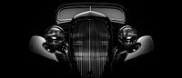 Een nostalgisch meesterwerk dat het elegante silhouet van een klassieke auto vastlegt in dramatisch zwart-wit. De glanzende koplampen stralen als ogen vol verhalen en avontuur. Deze foto voegt een vleugje vintage charme toe aan elke woonkamer en nodigt je uit om herinneringen op te halen aan vervlogen tijden.