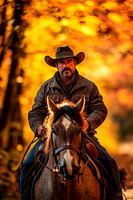 Te midden van gouden herfstkleuren rijdt een indrukwekkende figuur op een trots paard, die onder zijn hoed en diepe blik een verhaal van avontuur en vrijheid vertelt. Dit tafereel vol warme aardetinten en een nostalgische stemming geeft woonkamers en gangen een rustieke, uitnodigende sfeer. Ideaal voor iedereen die van het Wilde Westen…