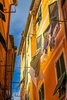 Kleding hangt uit het raam te drogen in een zonovergoten steegje in Vernazza, Cinque Terre, Italië