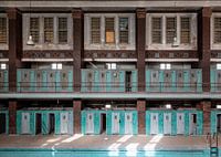 Veel deuren naar kleedkamers aan de rand van een oud en verlaten overdekt zwembad over twee verdiepingen