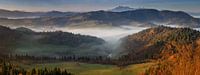 Panorama van Kleine Pieniny in de mist en Tatragebergte in het licht van de zonsopgang, Polen