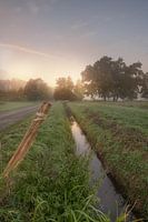 Een klein beekje in het eerste zonlicht van de dag. Een lichte nevel hangt in de lucht.