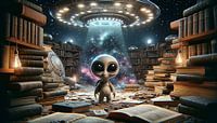Deze foto neemt de kijker mee naar de stille grandeur van een intergalactische bibliotheek die de grenzen van tijd en ruimte lijkt te overstijgen. Een kleine alien met grote, bedachtzame ogen en een zachte uitstraling staat centraal, omringd door antieke boekenplanken en zwevende boeken. Zijn lichaam lijkt bedekt met sterrenstof, waardoor het lijkt alsof hij zelf gemaakt is van de wonderen van het universum. Boven hem zweeft een UFO die een zacht licht uitstraalt dat zich vermengt met de gloed van de olielampen en een sfeer van mysterie en rust creëert. De houten boekenplanken en de verspreide boeken en documenten op de vloer wijzen op een lange geschiedenis van kennis en ontdekkingen.