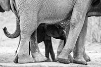 Een jong, klein olifantje valt in het niet tussen de volwassen olifanten