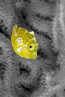 Klein geel visje in koraal. Foto zwart wit gemaakt behalve de vis. Ook beschikbaar in kleur.
