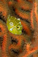 Klein geel visje in koraal. Ook beschikbaar in zwart wit met vis in kleur.