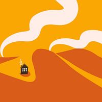 Een illustratie van een landschap met een klein huis met mooie details in trendy kleuren. Een kunstwerk, modern en trendy met een vleugje retro.