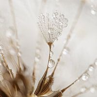 Natuurlijke pastelkleurige pluisjes dragen de kleine waterdruppeltjesMarjolijn van den Berg Abstract vierkantje: De druppeltjes rusten op een paardenbloemMarjolijn van den Berg