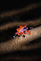 Dit kleine krabje heet een Traan krab en is ongeveer 1 cm groot en komen alleen te voorschijn in de nacht. Super leuk als ik ze dan ook weer eens tegen kom en gelukkig kreeg ik hem ook scherp op de foto. Het was tijdens een nacht duik in Aruba bij de duikstek :Gat in de muur. Het plaatje heeft mooie donkeren kleuren met in het midden de felle kleuren van het diertje. Dit plaatje zou heel mooi passen in lobby , eetkamer of woonkamer het brengt rust en Vreden.