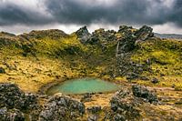 Klein meer in een kuil in het Landmannalaugar gebied met kleurrijke bergen rond het Landmannalaugar gebied in IJsland tijdens de zomer in het Fjallabak Natuurreservaat in de Hooglanden van IJsland.