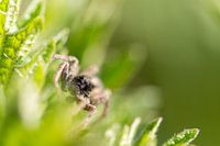 Dit kleine spinnetje zat rustig op een brandnetel, terwijl zijn soortgenoten bleven rondrennen. Doordat er met een macrolens is gefotografeerd komt het spinnetje mooi naar voren. Het groen van de bladeren zorgt voor een helder beeld.