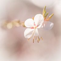 Macro foto van een klein fragieel zacht wit bloemetje. De meeldraden van de bloem zijn scherp in beeld gebracht. De achtergrond is wazig zodat de lboem goed naar voren komt. De foto heeft zachte lichte pastelkleuren. Een echte lente sfeer en romantische foto.