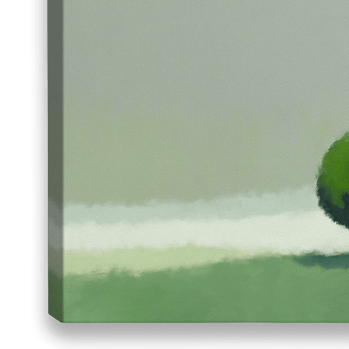 Een eenzame boom staat op een groen veld onder een serene, gedempte lucht. De minimalistische compositie benadrukt de rust en eenvoud van de scène.