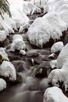 Lange blootstelling van een beek in het besneeuwde Beierse Woud, Beieren, Duitsland.