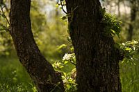 In een oude boomgaard in Groningen (Allersmaborg) met appelbomen van meer dan 70 jaar oud, bloeit een kleine bloesem op een oude stam in het zonlicht.