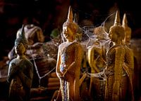 Koop de foto Kleine boeddha's verbonden door spinrag, Laos van Rietje Bulthuis op canvas, aluminium dibond, (ingelijste) fotoprint, behang en ArtFrame, op maat geprint in Fine-Art kwaliteit.