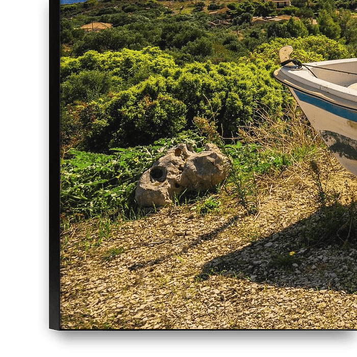 Een prachtig uitzicht over een deel van het Griekse eiland Zakyntos met de blauwe zee, het groene eiland en de prachtige blauwe wolkenlucht. Een oud bootje dient als voorgrond en staat op een uitkijkpunt.