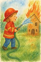 In dit vrolijke aquarel schilderij zien we een kind verkleed als brandweerman/brandweervrouw, vol overgave water spuitend richting een brandend huisje. De warme tinten van rood, geel en oranje contrasteren prachtig met het frisse groen van het gras en het heldere blauw van de lucht en het water.