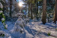 Een rijtje van jonge dennenbomen is bedekt met sneeuw. De zon versiert de boom vooraan met een lichtbol in de top, als een piek op een kerstboom. Een sereen winters tafereel, met een dik pak sneeuw op de ondergrond.