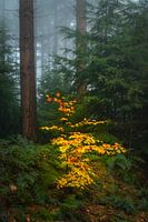 Kleine fel gekleurde beukenboom in een mistig dennenbos tijdens een mooie herfstdag in het natuurgebied de Veluwe in Gelderland, Nederland. Het kleine boompje valt op tussen de donker groene dennen.