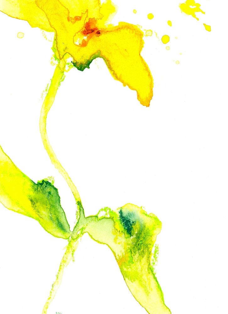 Kleine gele bloem is een handgemaakte aquarelschets in portretformaat, geschilderd door de kunstenaar Karen Kaspar.