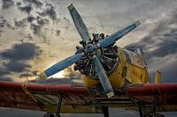 een klein historisch geel eenpersoons vliegtuigje met propellermotor.