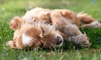 Een kleine bruine, harige hond ligt op een groene weide. De zon schijnt. De hond ontspant zich. Het dier ligt op zijn zij.