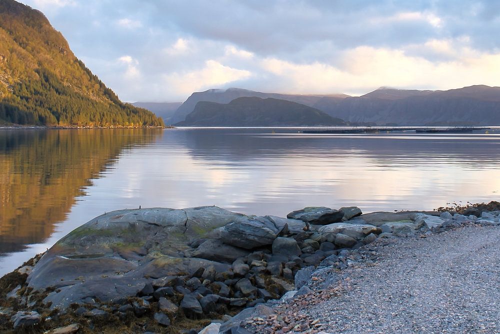 Westkaap in Noorwegen. Kleine haven aan het fjord met bergen aan de kust. Ruige natuur in Scandinavië