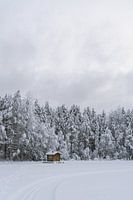 Over ‘Kleine houten hut op een bevroren meer in Finland | Winter in Fins lapland’ van Suzanne Spijkers