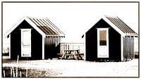 Twee kleine vissershuisjes aan de Oostzeekust in Denemarken. Zwart-wit foto met sepiatint.