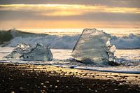 In het licht van de vroege ochtendzon glinsteren de ijsblokken en ijsbergen op het zwarte lavazand van "Diamond Beach" aan de kust van IJsland. Magische landschapsfotografie - niet alleen voor IJslandfans.