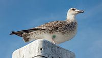 Dit is een kleine mantelmeeuw, volgens mij. Ik vond deze vogel bovenop een dukdalf in de haven van het Texelse havenstadje Oudeschild. Een dukdalf is een zware paal of constructie waar vaartuigen aan vastgelegd kunnen worden. Deze mantelmeeuw is een jong exemplaar, met veel bruin en wit. Deze stond op de dukdalf en voelde zich blijkbaar…