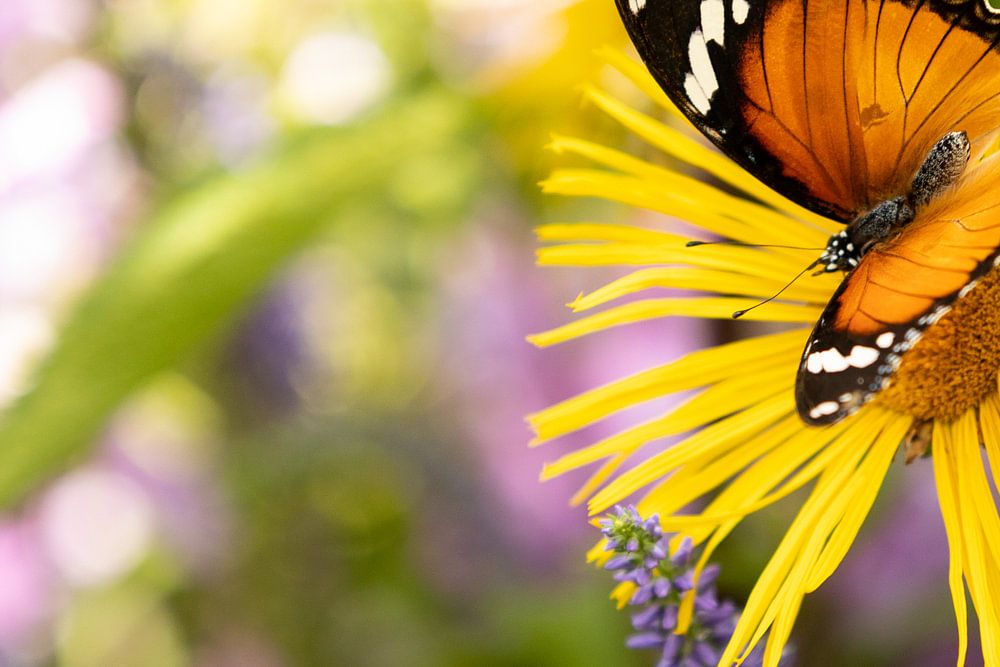 De tropische, oranje Kleine monarchvlinder (Danaus chrysippus) op een gele bloem in een vlindertuin. Op de achtergrond zijn vaag andere bloemen te zien.