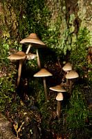 Koop de foto Kleine paddenstoelen aan een boomstam van Gerard de Zwaan op canvas, aluminium dibond, (ingelijste) fotoprint, behang en ArtFrame, op maat geprint in Fine-Art kwaliteit.