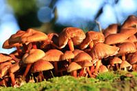 Groep kleine bruine paddenstoelen groeiend in het bos op een dode, afgezaagde boomstronk verlicht door de herfst zon.