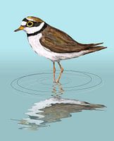 Een tekening met ecoline markers van een kleine plevier. De vogel staat in het water. De tekening is digitaal nabewerkt. De reflectie is digitaal toegevoegd, met waterkringen in vector. De achtergrond is een digitaal verloop.