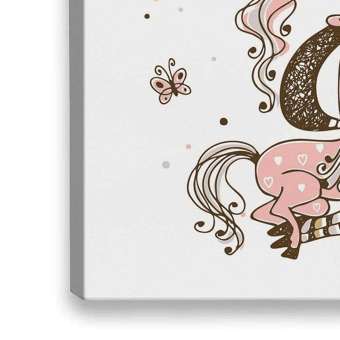 Tekening van een schattig meisje met een paard met hoorn die een knuffel krijgt. Het haar van beide is roze en de meid heeft een kroontje op. Er vliegen een paar lieve vlinders rond.