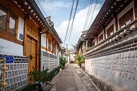 Kleine straatjes in Seoul met huizen in authentieke bouwstijl. De huizen bestaan uit steen met houten ramen en deuren. Tijdens een zonnige herftdag.