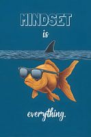Een gouden goudvis zwemt onder het wateroppervlak in een diepblauwe oceaan. Hij draagt een zwarte zonnebril en een opvallende haaienvin, met de woorden "Mindset is everything" in beeld. De scène combineert een onderwaterwereld met tongue-in-cheek symboliek.