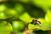 Een macro shot van een vlieg op een blad.