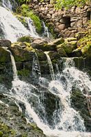 Kleine waterval in Zweden. Mos op stenen. Bos aan de oever. Scandinavische natuur